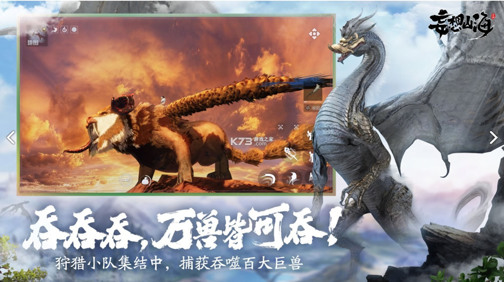 《妄想山海正版游戏》手游的世界设定在“山海经”的背景故事中,却又跳脱于山海,设定了迥异的百种异兽神兽,不管是体型庞大的巨兽还是翱翔天际的异兽,皆可进行捕捉。捕捉成功后可以直接用作骑宠,或用于孵化培养,通过吞噬其他异兽来进一步地成长进化获得更高阶的能力。是的!这次真的有鲲!还可以养鲲、吃鲲,可以驯龙驭凰,上天入海各类异兽任意捕捉。