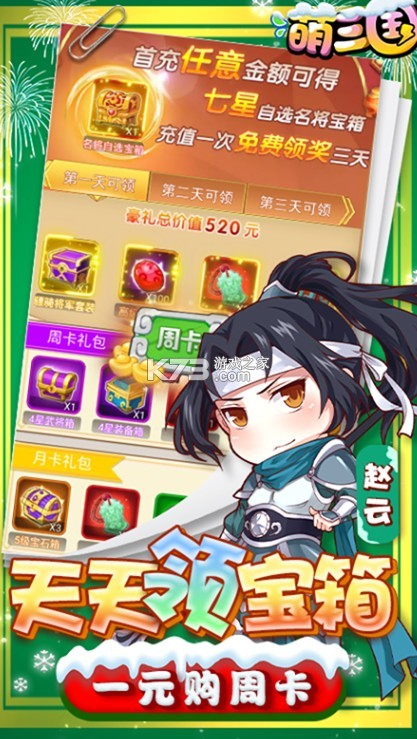 ★首充就送名将自选宝箱,各路英豪任君选择!,绝版将军套装,次日和三日每天都送一套6星装备宝箱!一元周卡领7天!天天都有宝箱给!!基金低价激活!超多元宝免费送,数量高达数十万!!