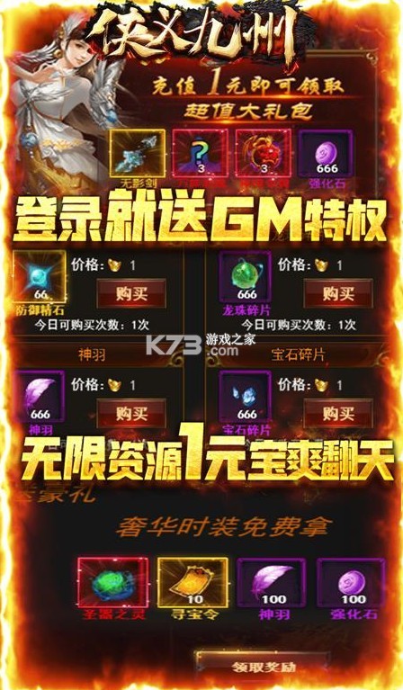 新手礼包(xs123):神羽*100、宝石碎片*100、强化石*100、金币*500000