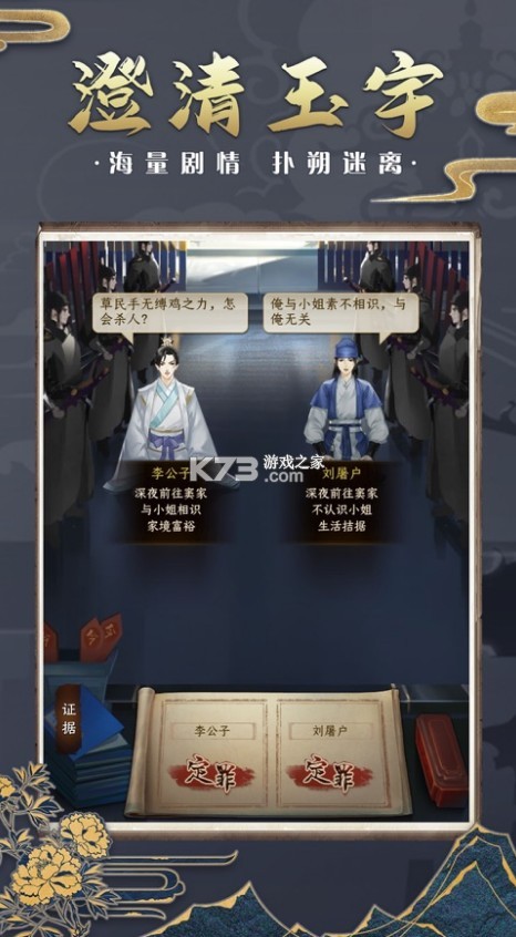 一款二次元冒险的游戏还原案件过程,游戏中的所有案件都充分测试了玩家的思考能力和观察能力,化身为大理寺捕快。