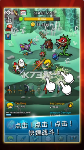 放置冒险成长挑战,指尖激斗等你体验,几十种魔物,上百种合成武器道具,就等你来轻松打造哦。