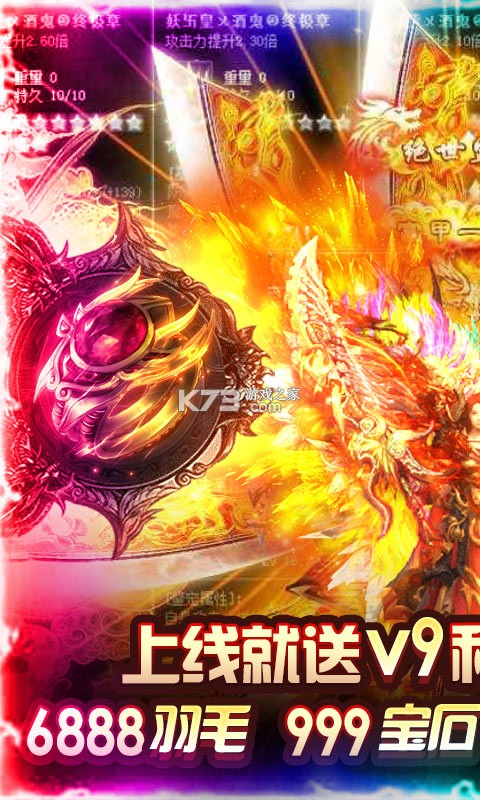 ★上线就送VIP9、64万元宝、66666绑元、1亿金币、一级宝石*999、羽毛*6888