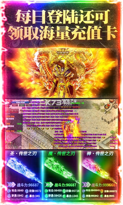 力求让玩家体验到强效速爽,实在痛快的自由真人PK体验。传世宝刀,黄金战甲,炫酷羽翼免费赠送,多样福利拿到手软。