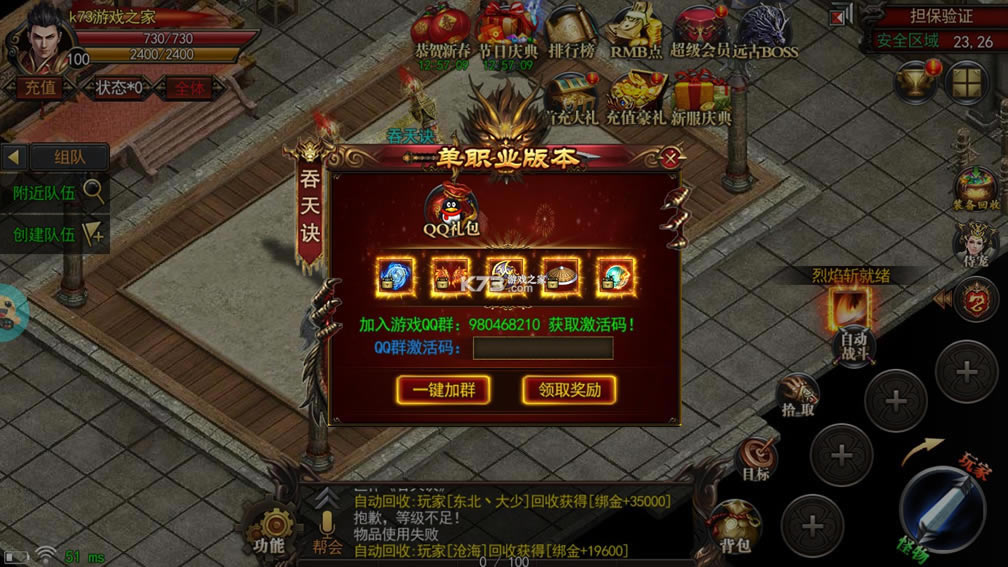 跨服PK,体验不变激情。 地下夺宝、BOSS战场、待你一战成名!