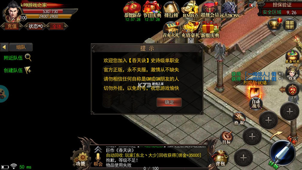 跨服PK,体验不变激情。 地下夺宝、BOSS战场、待你一战成名!
