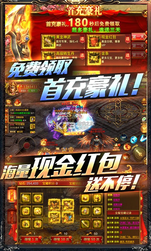 三职业各司其职,人人带白虎,极致攻伤,一刀致命!PK打宝战沙城,热血豪杰闯天下,领取免费首充直升VIP21!