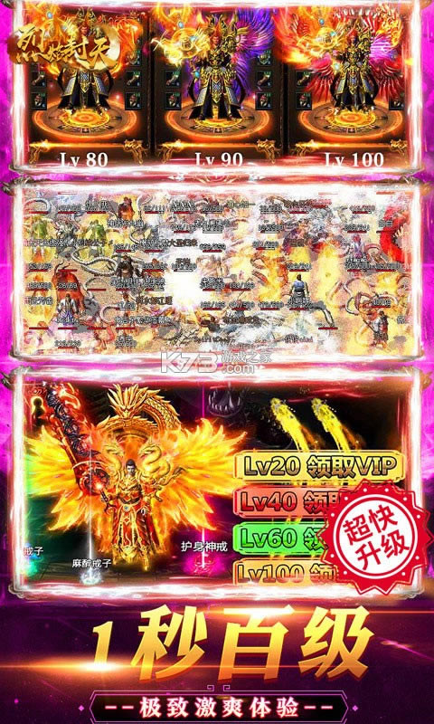 《烈焰封天-激爽版》激爽版是一款独创1秒百级,刀刀斩杀,创号三角色,真百倍爆率的全新传奇类手游。最强开局福利,1秒百级,1元超低月卡
