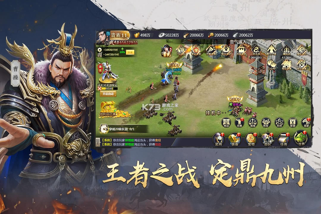 2020年殿堂级写实画风大作回归!离线也能打怪升级的三国题材的挂机策略国战游戏强势登陆!令你身临经典的三国剧情,招募三国名将为自己所用,以你君主之才能排兵布阵,与诸位乱世枭雄斗智斗勇,最终成就三国一统之伟业!