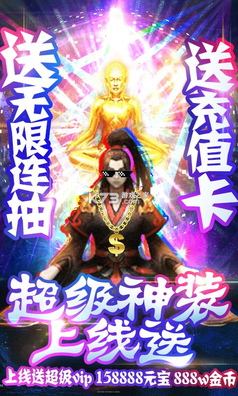 1.上线就送满V!充值比例1:1000!立刻领取158888元宝!888W金币!超多奖励领不完!