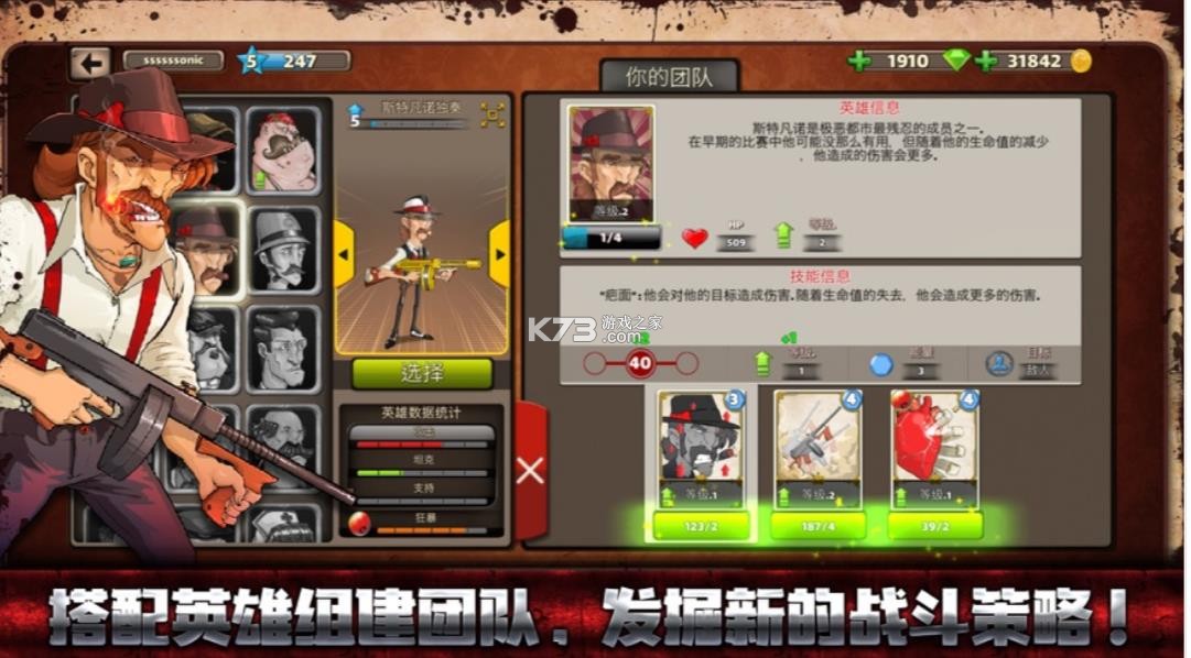 在你的黑帮成员中,您可以从中选择三个英雄来开始与其他对手的在线战斗。 您还可以从不同类型的英雄中(例如坦克肉盾,辅助型和进攻型)创建团队。 每个英雄都有各自不同的技能和特性。 选择正确的英雄组合,并且及时使用他们的技能是取胜的关键。