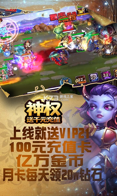 《神权-送千元充值》是一款致敬魔兽的挂机策略手游,上线就送100元充值卡,10元,50元,100元充值卡副本通通产出,每日在线送充值卡,等级奖励免费送千元充值卡;