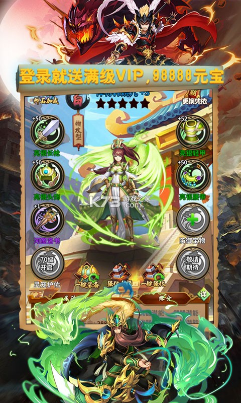 9、关卡福利:海量元宝、英雄碎片、海量征兵令、海量银两、海量突破丹等。