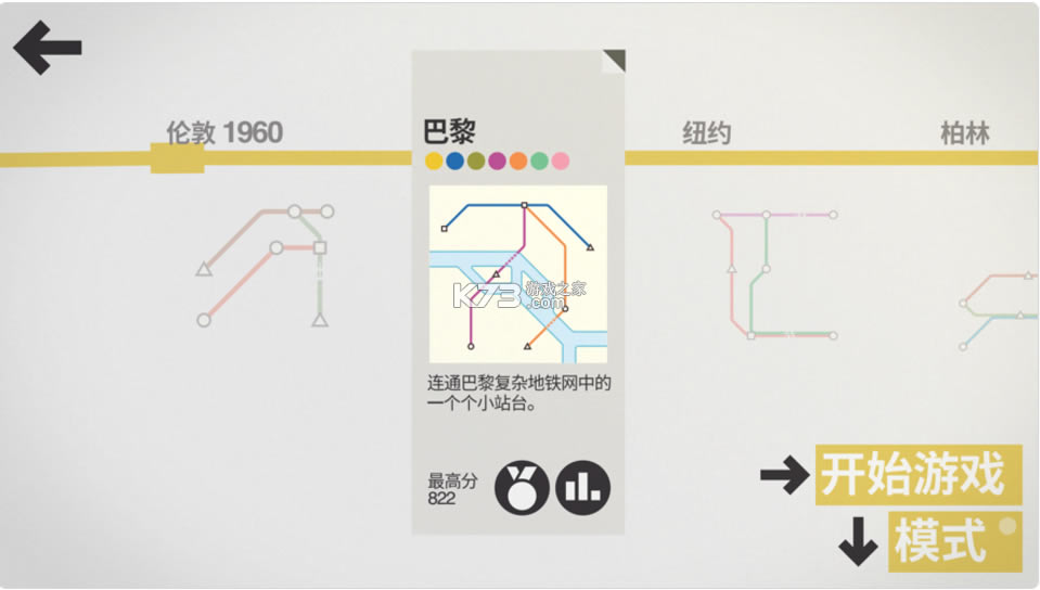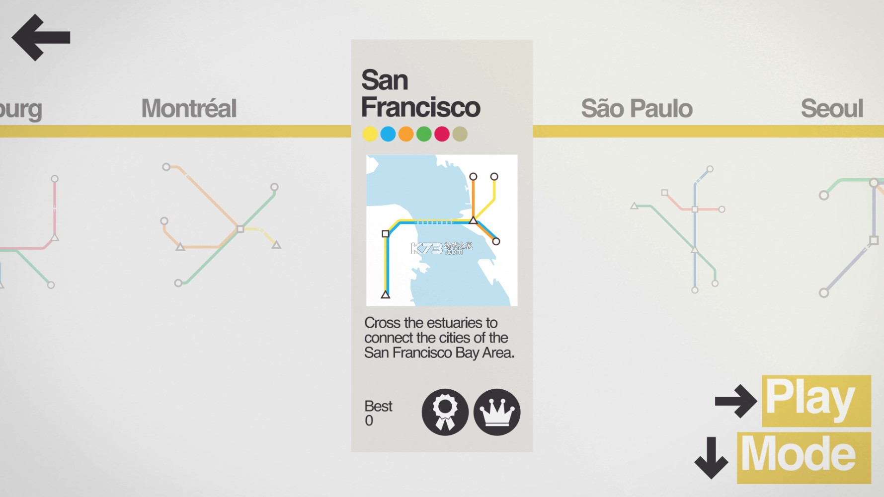 模拟地铁的游戏原则是为不断扩张的城市人口设计适用的地铁管网。在两个站点之间划线便可连接管路,让车厢穿梭其间。在新站点出现时,及时修改线路规划,不断提高运输效率。在有限的经费、资源面前权衡得失。你是否跟得上城市发展的脚步呢?
