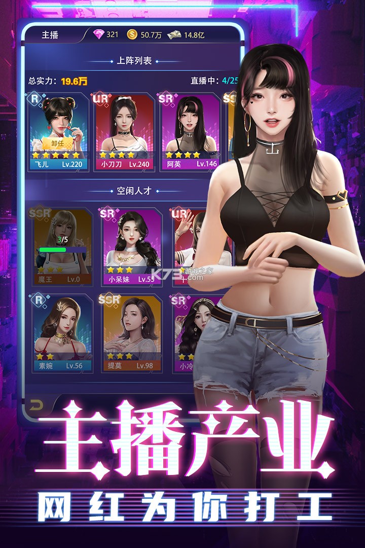使用一笔赞助资金开启直播创业之路。通过发掘、招揽有潜力的主播,打败敌台网红,逐步提高产业和主播们的吸金能力与扩张直播产业帝国。在这过程中,豪车美酒、美女相伴也必不可少,游戏将把您代入真实的商战体验。
