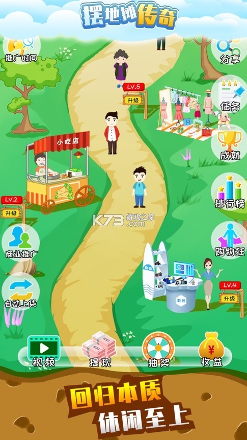 在公园中经营自己的地摊,白手起家一步一步变成商业大亨,水果摊、服装摊、饮料店、烧烤摊随意选择,通过低买高卖、升级店铺、招募明星扩大利润,实现暴富人生。