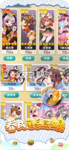 动动手指挂挂机,即可获取大量金币爱心,解锁不同风格的可爱厨娘,收集各式美食菜谱,经营打造个性餐厅!