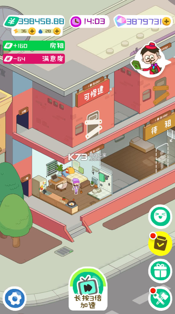 这款模拟经营出租房屋游戏进行完美破解的版本,无限金币免费送,并且免除了所有的内置广告,广告收益直接发送到账户上,让玩家沉浸式体验作为房东,单靠收租就过的风生水起的快乐生活