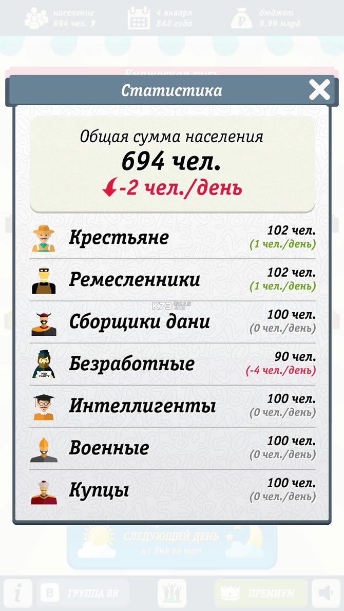 在俄罗斯的模拟游戏中,你从862年开始玩,在那里,诺夫哥罗德人邀请了三位瓦良格王子。从这一刻起,俄罗斯的命运就掌握在你们手中。你必须进行战争,贸易,发展你的领土。