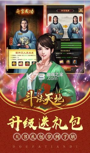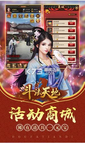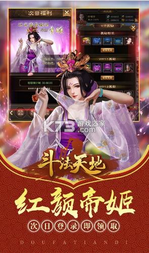 《斗法天地》每天上线领充值福利,升级免费送天书礼包,让你拿到手软,开通资源商城每天不断领,签到拿丰富的奖励,送稀有道具1元宝,首冲送精品道具,充值任意金额即可得吕布,红颜帝姬次日送。