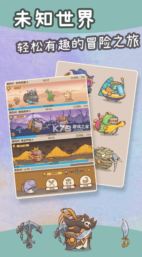 庄园的主人奥利也没闲着,还要外出探险获取经营庄园的物资。不过探险途中充满惊险,奇妙森林、机械迷城、灵异雪原、炙热荒漠......各种鬼怪出没拦路,快来给奥利加油!