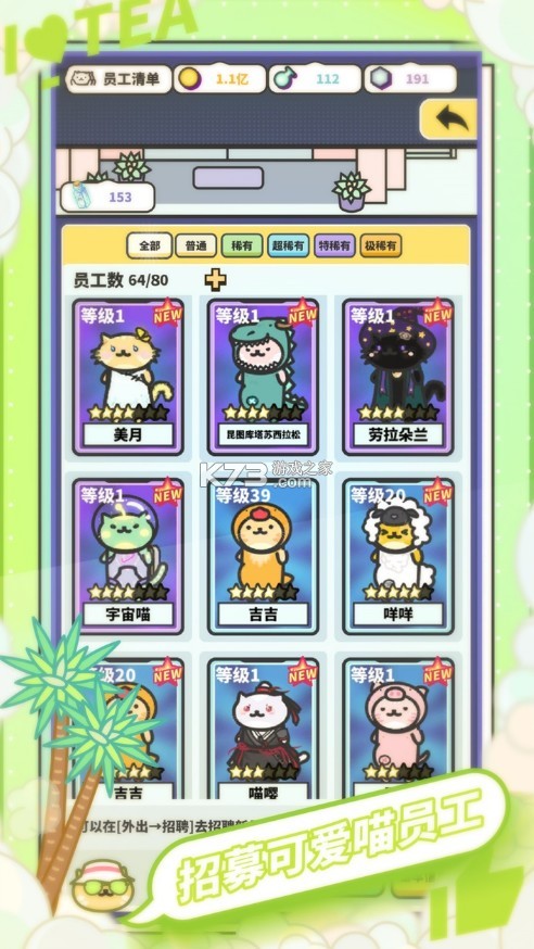 你需要雇佣可爱的猫咪为你工作,加快制作进度。为了不断研究新的奶茶配方,提高店的人气值和吸引力,还需要升级原料,升级猫咪。还可以装修店面,解锁周边装饰才能更广地吸引客源。