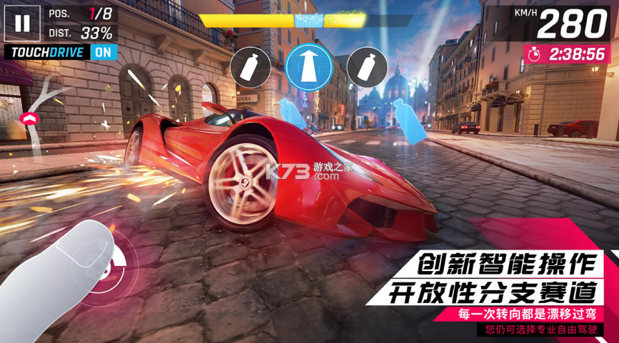 在智能操作模式下,玩家不用顾忌精细的转向,只要根据提示大幅滑动选择路线即可,熟练过弯才能够驾驭大师操作模式。