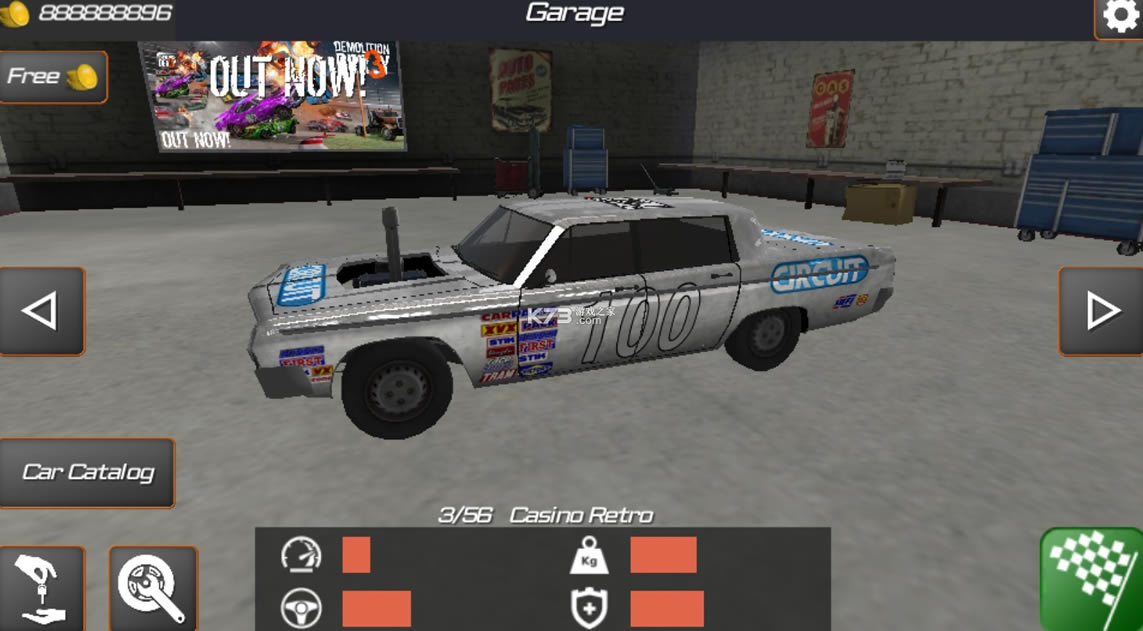 很适合发泄的游戏,刚进去的时候是小破车,随着比赛获得的金币,玩家可以购买各种赛车,买车之前,玩家还能试驾,驾驶汽车到公路上尽情的撞击破坏吧,反正又不花钱!