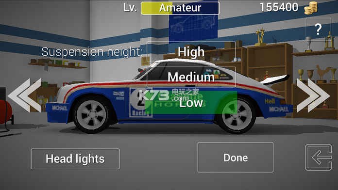对于每辆车,您可以选择:轮胎,高度和刚度的悬架,齿轮比和夜间大灯!