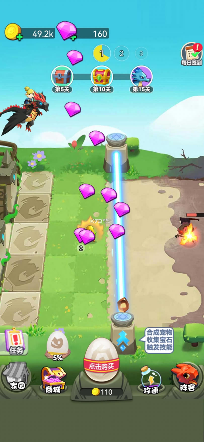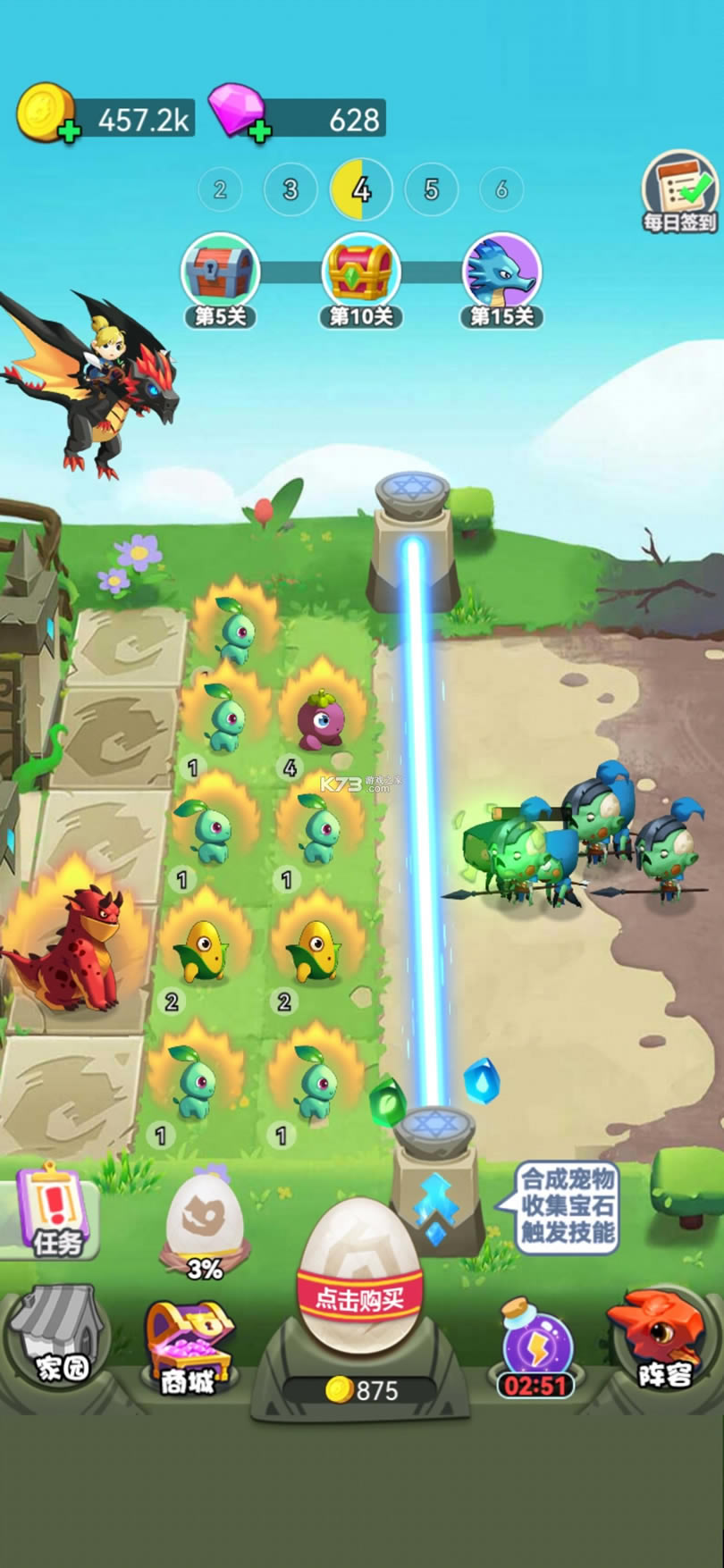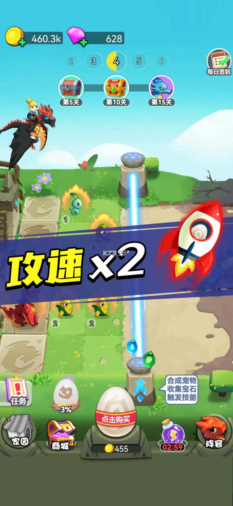 可以免广告获取更多的金币和钻石,作为一款塔防策略游戏,你需要合成更高级别的恐龙才可以消灭僵尸,游戏还有商城道具可以购买,放置战斗更轻松,快来试试吧!恐龙大战僵尸手游是一款不错的塔防类游戏,玩法还是非常的独特的利用合成与种植的方式来击败僵尸的进攻,当然这个总体框架上来看还是跟植物大战僵尸有着一点点的关系,不过问题不大,每一个角色都是那么的可爱有趣,而且就连僵尸都是呆萌的,值得推荐的一款游戏哦!