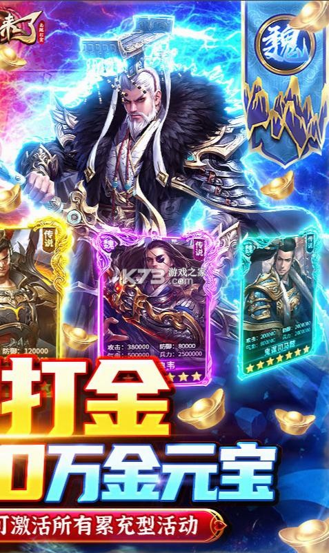 在游戏中,你将置身于三国战场,发展势力,招募良将,和盟友一起争夺洛阳!不需要担心土豪大佬碾压全服,游戏内剿灭土匪充值卡无限爆、资源无限打、升级就送500万元宝,充值卡可激活所有累充类型的线上线下活动。