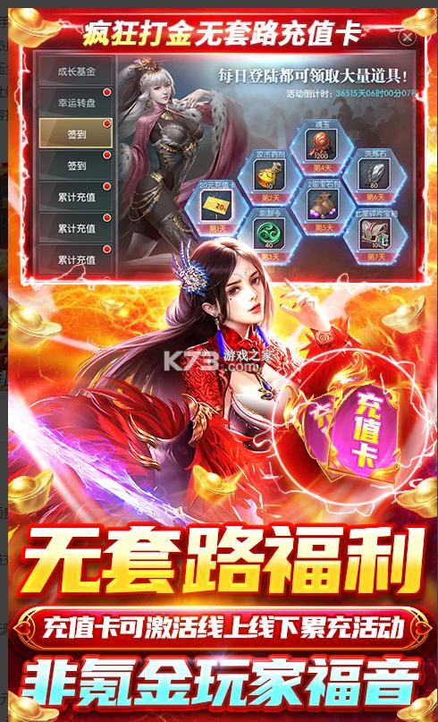 ★真实福利:本游戏承诺所有充值卡均为真实无套路充值卡,使用即可激活所有累充类型的线上线下活动(包括元宝返利),0氪也能享受RMB玩家的快乐!