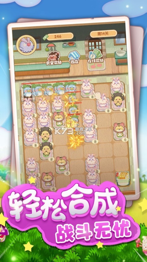 一款采用超可爱卡通风格打造的趣味合成挑战游戏。超可爱的卡通画风呈现,我们要进入到不同的场景之中去体验最具乐趣的玩法,努力的提升你的合成技巧,快速的获取到更好的防守道具,让自己在闯关的时候能够更加轻松,保卫你的食堂,让游戏变得更为过瘾。