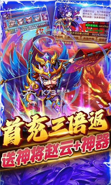 3.充值比例1:1000,首充3倍元宝返利,首充即送极品神将【神赵云】,超强橙武,续充再送稀有红色装备。