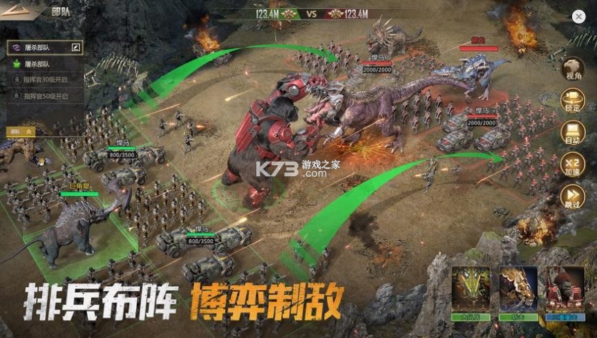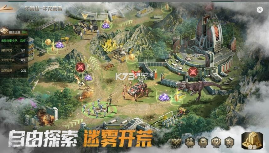 当人类军队与科技巨兽结合,将会解锁一个突破想象的全新战争模式!各种近战、远程、装甲巨兽任你处置。突破能力强的霸王龙、快速出其不意的迅猛龙、拥有移动堡垒的巨龟、远程压制的强火力长颈龙可以自由搭配数十人的兵种,不同的野兽和部队可以投入不同的战场态势运筹帷幄,抢在敌人前面!