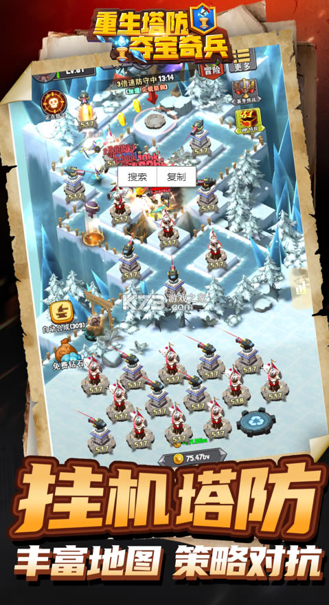《重生塔防夺宝奇兵免广告版》一款集合休闲策略塔防,挂机防守,无限合成的放置手游,游戏具有丰富多样的玩法,不同的士兵搭配的出不同的阵容效果,建立完善的防御塔阵容,抵御它们的进攻。