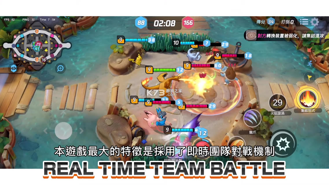 5v5即时的战斗动作竞技体验,每个宝可梦都有三个不同的技能,通过升级进行解锁。