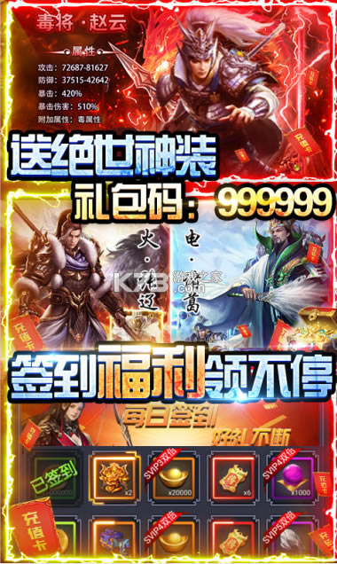 ★上线即送三重豪礼,送银龙赵云!礼包码:666666!送毒奶华佗!礼包码:888888!送绝世神装!礼包码:999999