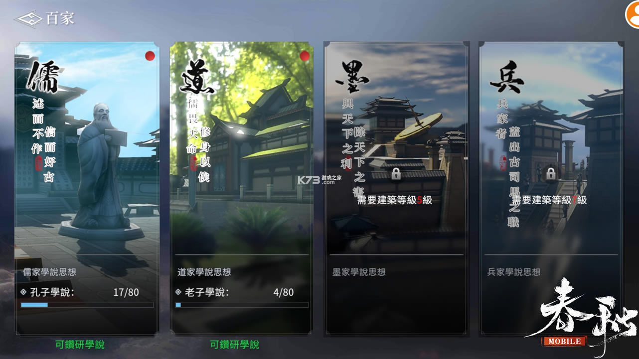 春秋战国是一座可以尽情挥洒智慧,实现战略雄心的英雄舞台。七大列强让中华文明从分裂走向大一统。游戏中不仅有吕不韦、芈月、白起等众多历史名人,每个国家更有特色兵种让你在战争中尽展所长。诸子百家、变法图强的众多玩法将会为您呈现一个辉煌灿烂的时代。