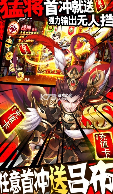 3、首充即送三国第一金色猛将—吕布,强力输出无人可挡,若与貂蝉组合羁绊,完爆敌人
