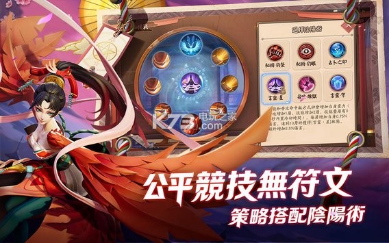 《决战!平安京》告别符文系统,取而代之的是任何玩家都可以免费搭配的“阴阳术”。玩家可以根据自己的战术策略,自由搭配“阴阳术”,让游戏更富有变化。而且,游戏内没有任何影响战斗数值的付费系统,做到真正的绿色公平对战!