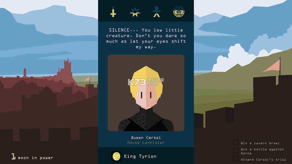 《王权权力的游戏(Reigns: Game of Thrones)》是款以美剧《权力的游戏》为背景打造的策略类游戏,游戏的剧情十分的丰富,提供多样的角色供玩家选择,你将体验一步一步登上权利巅峰的过程。