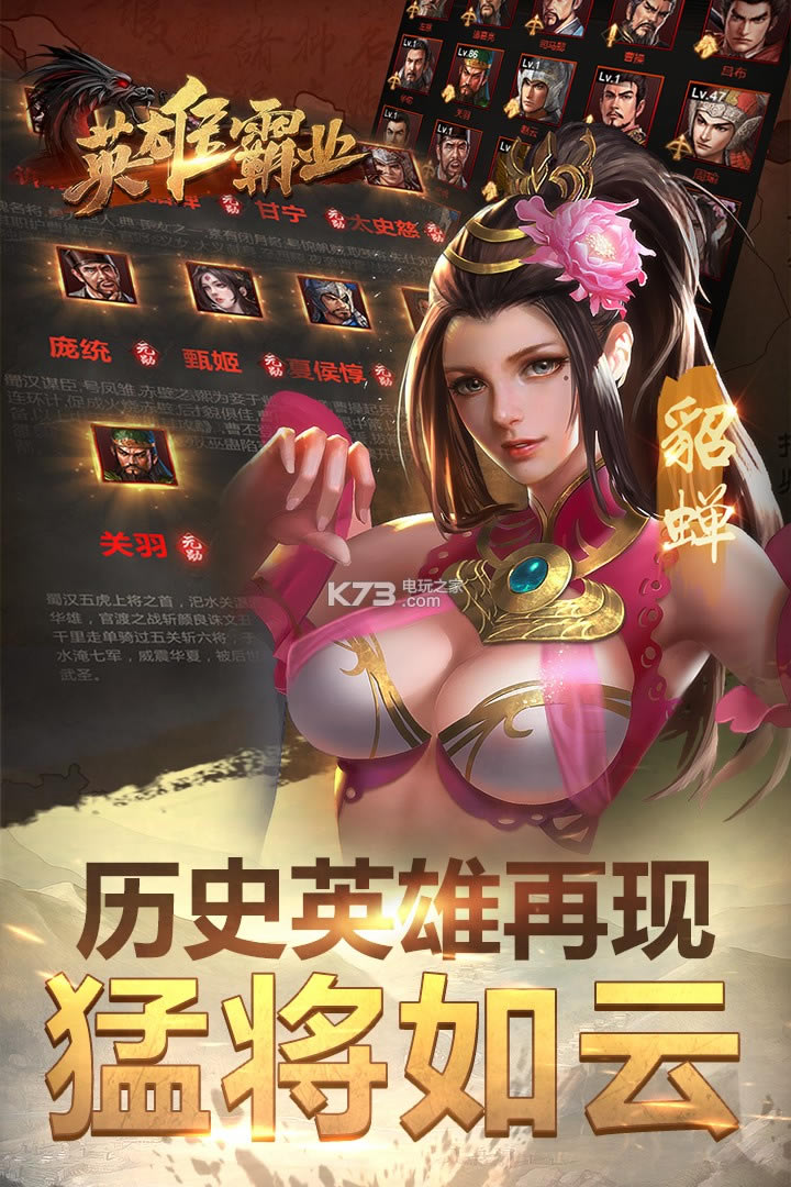 《英雄霸业手游》年度策略对战竞技游戏。联盟争霸的游戏内容,全服国战角逐游戏,经典的三国历史背景,无限制自由国战竞技,多样的武将培养设定,成就你的乱世争霸之路。