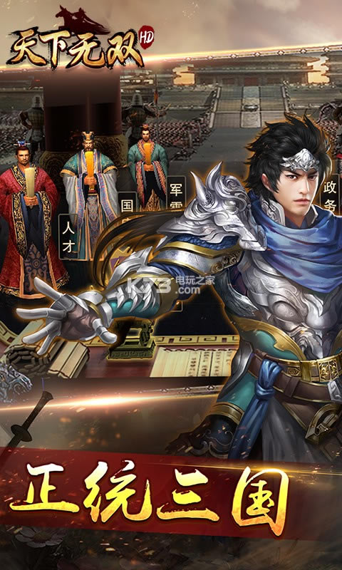 游戏主打正统三国,百分百还原君王体验。乱世中涌现的文臣武将会悉数登场,在朝堂上听候玩家差遣。