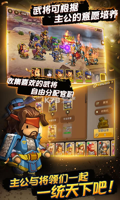 武将大致分为几种职业,坦克,近战输出,远程输出,魔法输出,辅助,玩家合理的利用资源分配打出最佳化的配合是游戏获胜的关键。