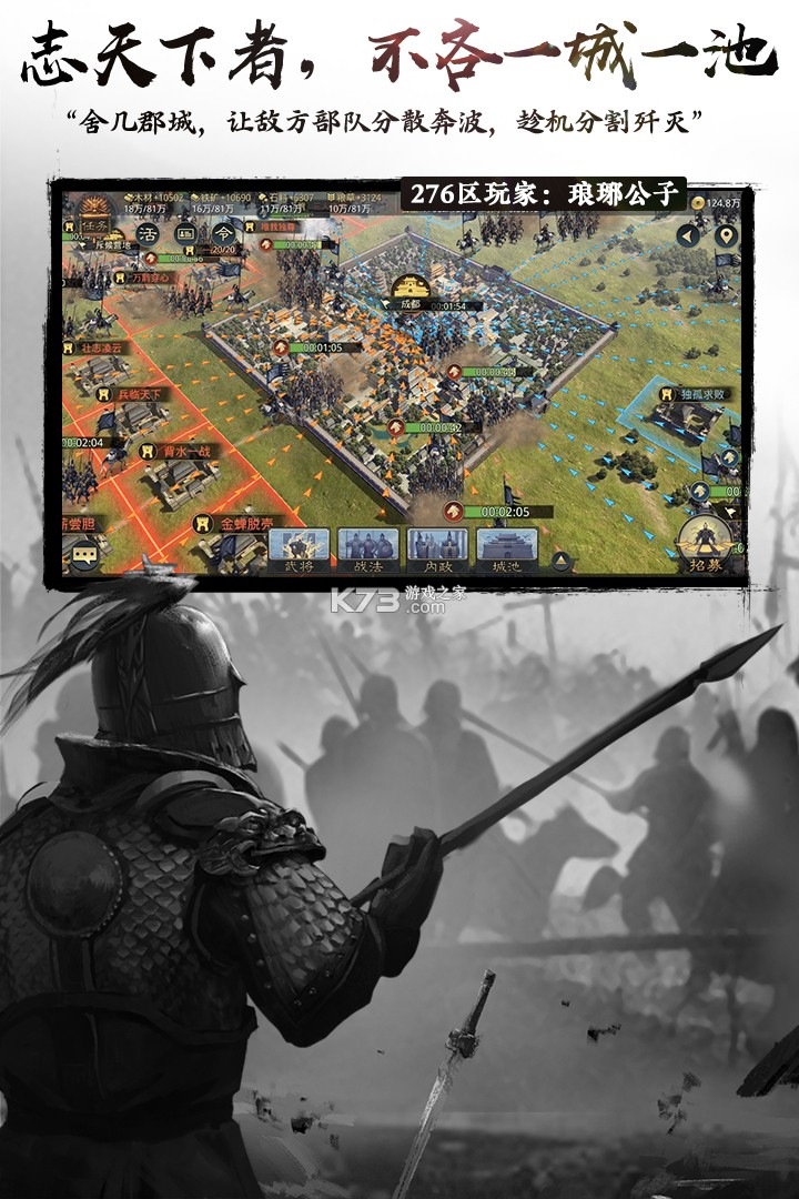 225万格土地,十万支部队,在东征西讨中,还原冷兵器时代集体行军,安营扎寨,分团作战,就地征兵;