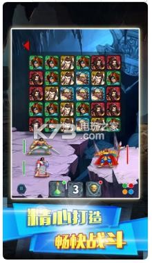 玩家进入游戏后会拥有多位三国英雄,此游戏中可以不断地给自己的英雄升级购买装备等,完成游戏主页提示的任务副本,也可以到PK页面中享受战斗的快感,进入战斗页后,页面上方会出现一个6*6的人物头像合集,玩家可以消除两个以上的相邻的相同头像,可以消除三次,三次累加的相除头像数为玩家此回合的攻击值,底部也有道具可用,敌人会再玩家攻击后自动反击,血量先为0者失败.