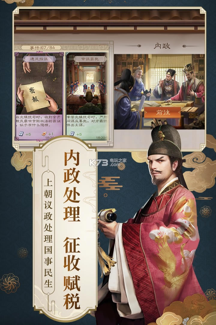 养成系统:日常处理政务要事,培养文臣武将,励精图治国库充盈。