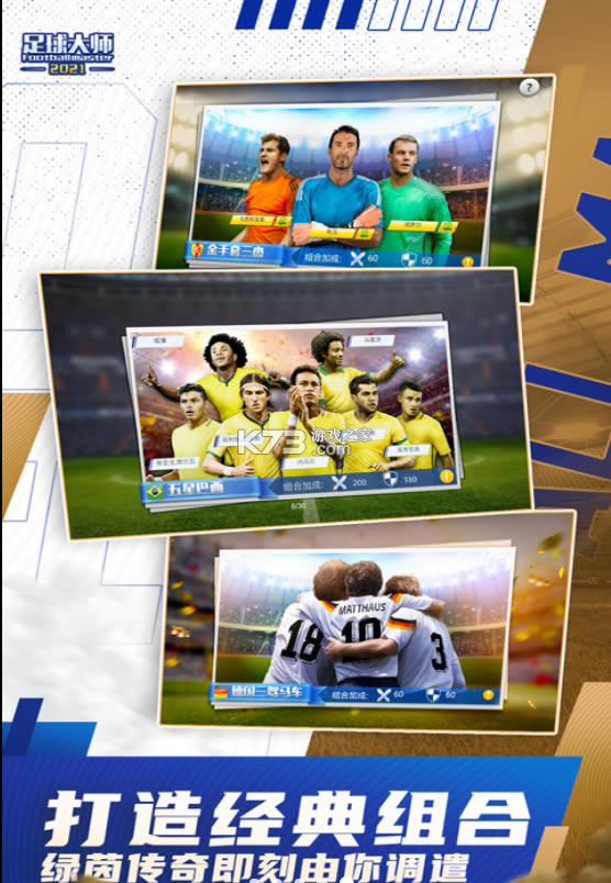 多样的球员搭配,打造您的最佳阵容。还在等什么?快来加入这片绿茵球场与百万玩家一齐开启全新的足球经理人时代《足球大师黄金一代vivo版本》是款手机足球模拟类手游,玩家将成为一名足球指挥大师,你可以定制一支前所未有的球队,让不同位置不同实力的球星们全部集结到一支队伍,打败所有通往世界杯大力神杯道路上的球队。