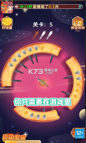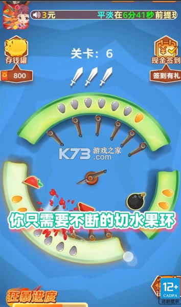 极速飞刀,一款经典飞刀类型的手机游戏,也是闯关就能赚钱领红包的福利之作,选择适当时机,发射飞刀,插住水果,完成目标任务就可以过关了。