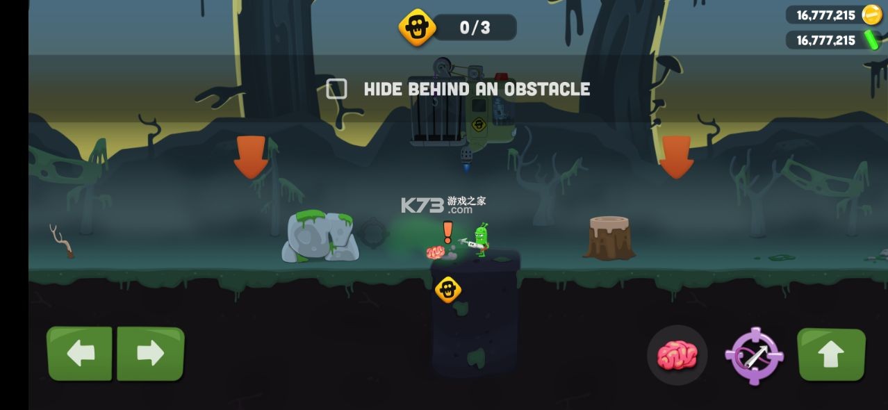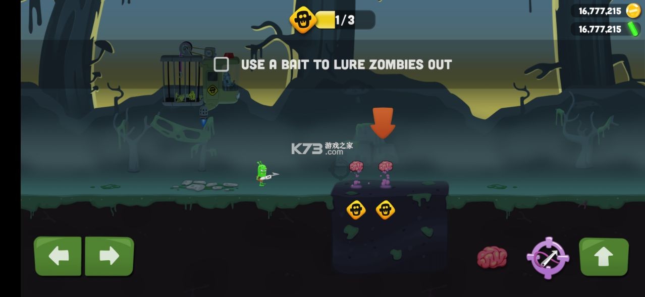 游戏在操作上采用了比较经典的按键控制方式,屏幕左下角的按键可以控制主角左右移动,右下角则有跳跃、攻击等按钮,方便玩家们轻松掌控挑战过程。游戏中对操作的要求并不高,玩家们通过食物来引诱僵尸出现,然后利用武器抓捕它们即可,并不像射击游戏那么紧张的气氛,也没有动作游戏那么激情的过程。